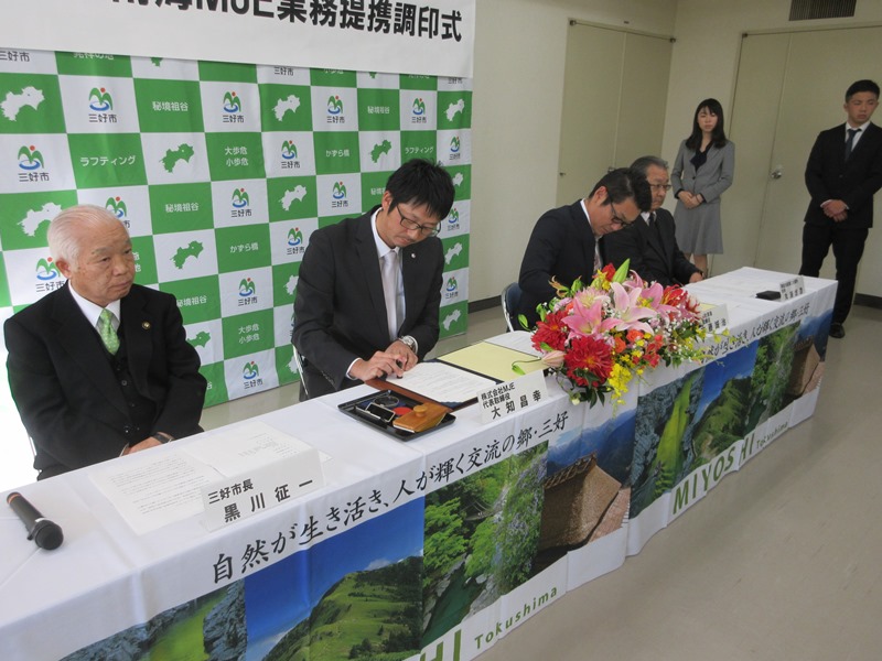 三好市サテライトオフィス誘致プロジェクトがきっかけとなり、三好市の老舗企業「株式会社南海(代表取締役 木藤誠治)」と大阪市に本社を置く「株式会社MJE(代表取締役・CEO 大知昌幸)」が業務提携協定を締結するに至りました。