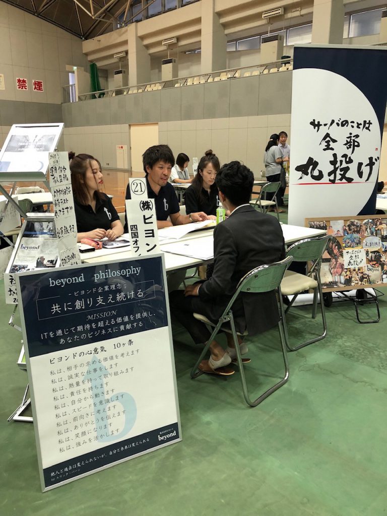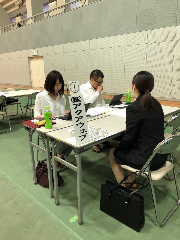 当日は80名を超える求職者に来場していただき、ビヨンドさん、アクアウェブさんともに若い求職者の方が次々にブースを訪れ、会社概要や仕事内容等についての説明を熱心に聞かれていました。