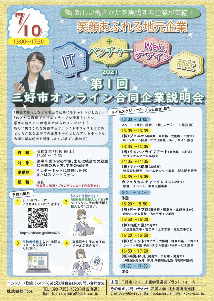 三好市では、市内企業の人材確保とコロナ禍で就職活動に影響のある学生等を対象に「とくしま産学官連携プラットフォーム」と連携し、三好市オンライン合同企業説明会を実施します。
