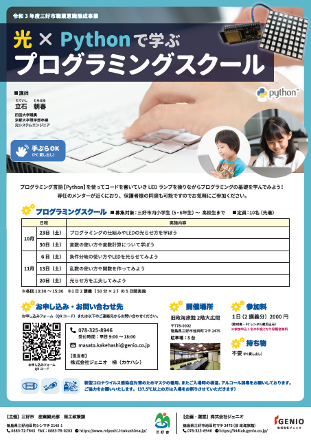 三好市では、市内の児童・生徒に対し、学校以外でも楽しみながら「プログラミング」に触れる機会を創出することで、将来のIT人材の輩出に繋がることを目的に「三好市職業意識醸成【プログラミング教室】事業」を昨年度から実施しています。